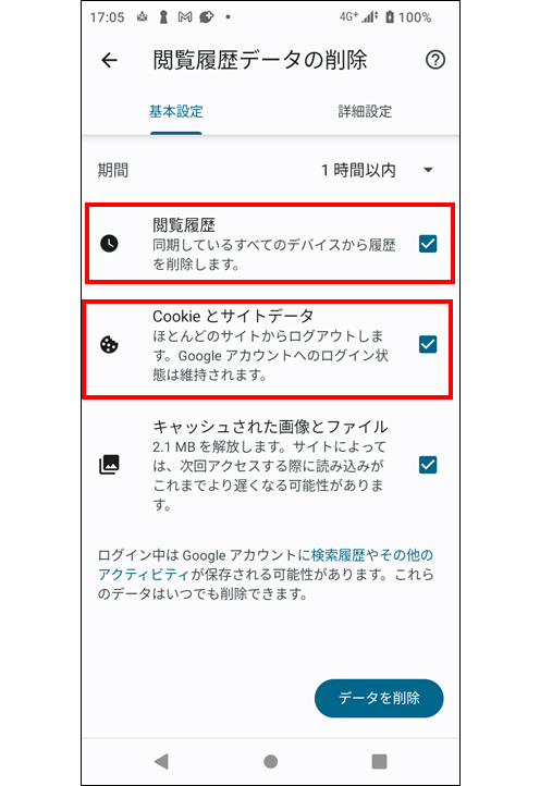 →「Cookie とサイトデータ」と「キャッシュされた画像とファイル」にチェックを入れる