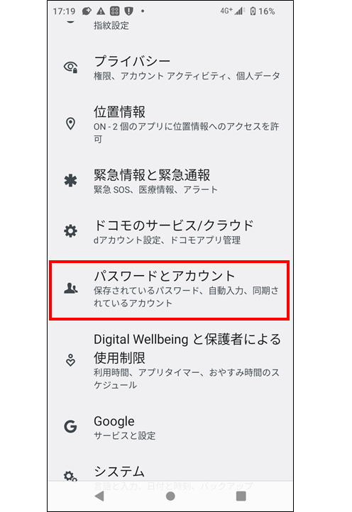 →「パスワードとアカウント」を選択。