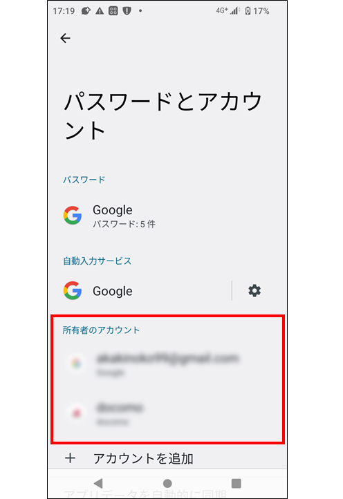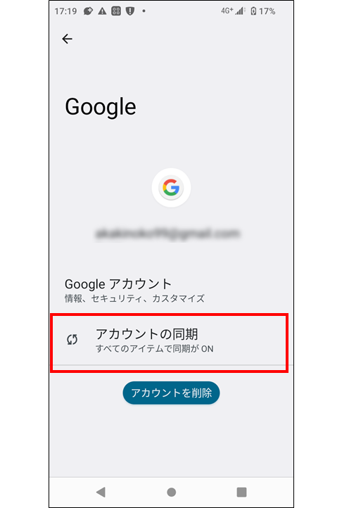 ※機種により、「アカウント」を選択せずに「Google」を選択する場合や「アカウントと同期」を選択する場合もあります。