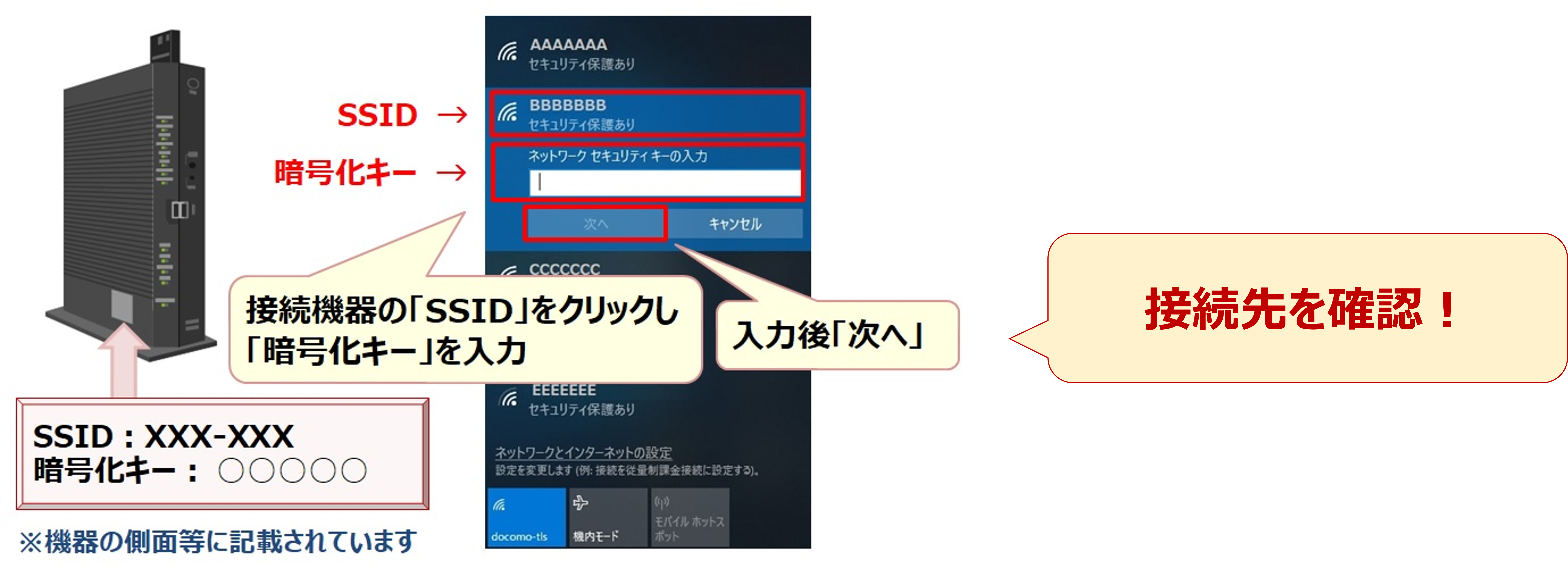 Wi-Fi接続する際の接続先(SSID)やパスワード(暗号化キー)の確認方法をご案内しています!