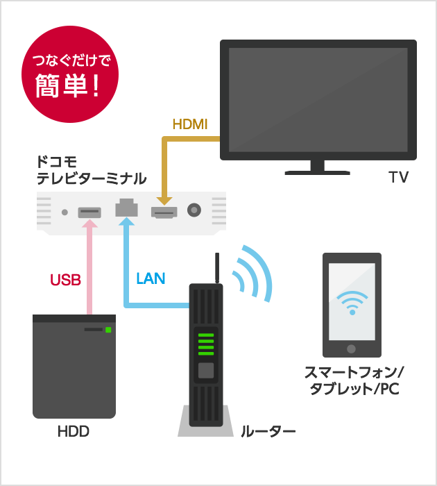 録画にはUSBハードディスク(別売)が必要です。「ドコモテレビターミナル」とつなぐだけのカンタンな設定ですぐに録画ができます。
