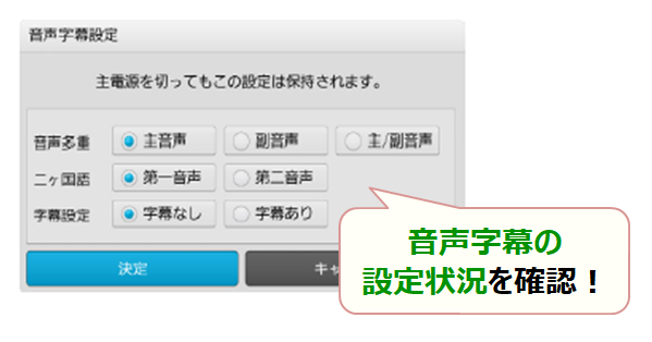次に、「映像/音声設定」の「音声字幕」を選択し、音声多重や字幕設定をお好みの設定に変更してください。