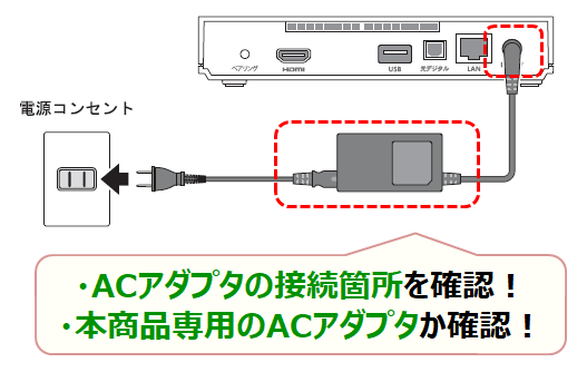 ACアダプタがチューナー本体に正常に接続されていない可能性があります。