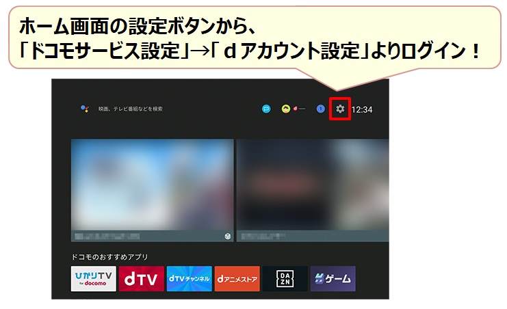 ログインは、ホーム画面から 「設定」→「ドコモサービス設定」→「dアカウント設定」より行うことができます。