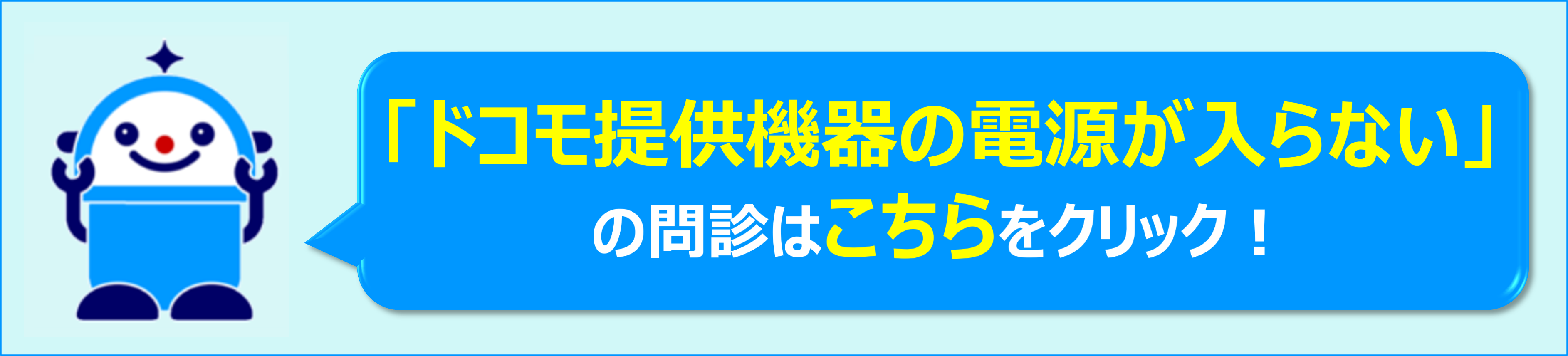 ドコモ提供機器(PR-500KIなどのホームゲートウェイ・GE-ONUなどの回線終端装置・ルーター・モデムなど)の電源が入らなくなった場合、機器の再起動、およびケーブルの緩み確認を行うことで、改善する場合があります。