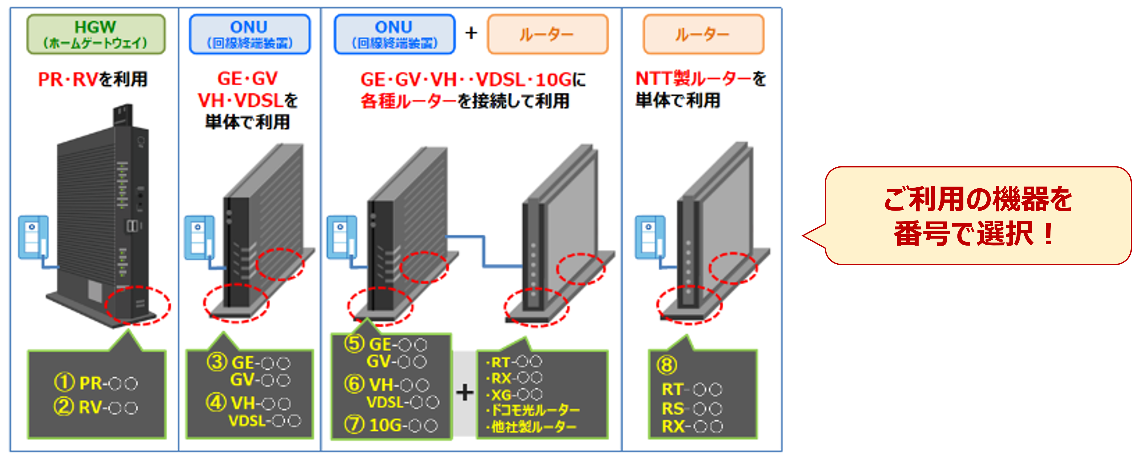 「PR-○○」「RV-○○」 「GE-○○」 「GV-○○」 「VH-○○」 「VDSL-○○」 「10G-○○」 「RT-○○」 「RX-○○」 「XG-○○」