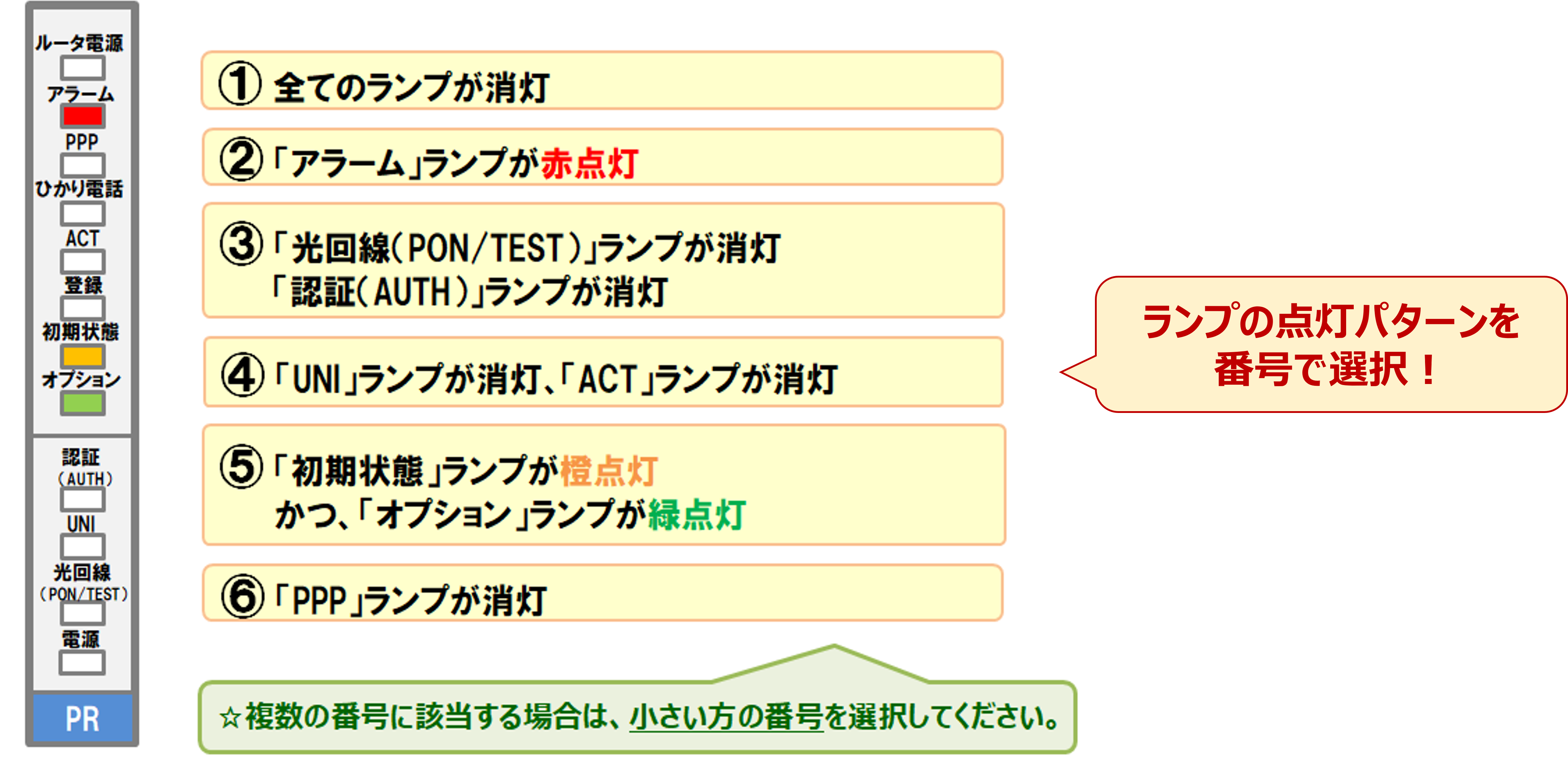 「ルータ電源」「アラーム」「PPP」「ひかり電話」「ACT」「登録」「初期状態」「オプション」「認証(AUTH)」「UNI」「光回線(PON/TEST)」「電源」
