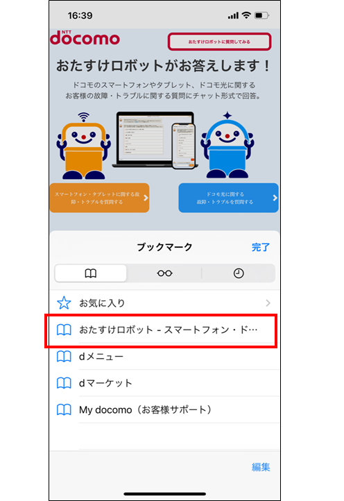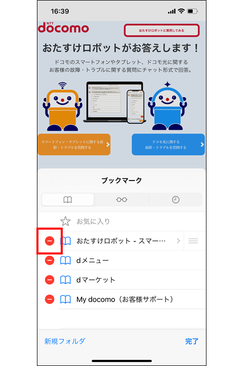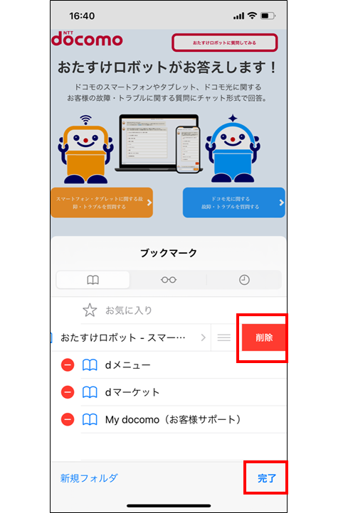 ⑤右側に「削除」と表示されます。「削除」をタップするとブックマークに登録したページを削除することができます。「完了」をタップで編集を終了します。