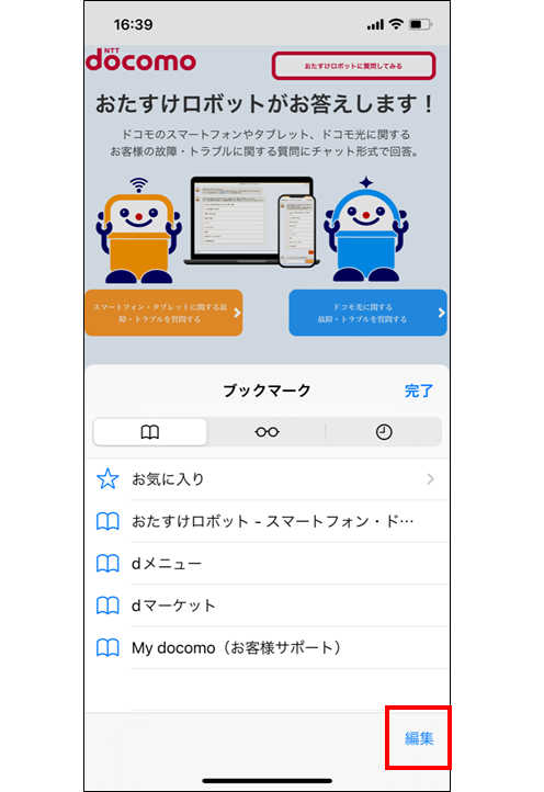③「ブックマーク」のタブを開き、「編集」をタップします。