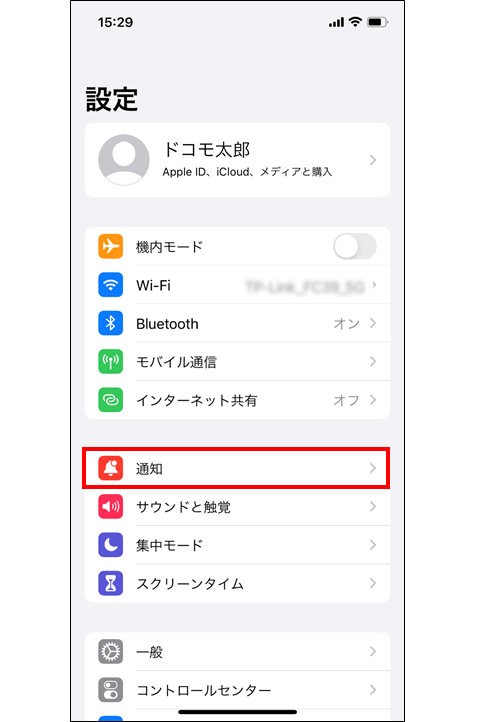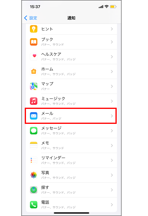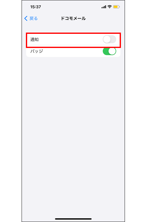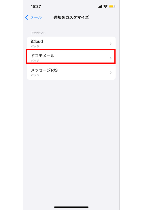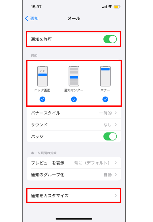 ホーム画面にて、「設定」をタップ →「通知」 →「メール」 →通知を許可がONになっていることを確認し、「通知をカスタマイズ」をタップ →「ドコモメール」をタップ →「通知」をタップしてON(緑色)にする