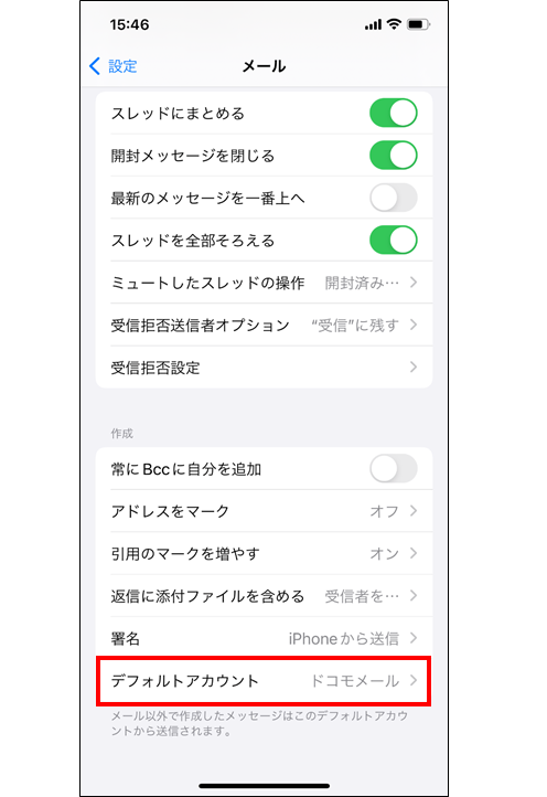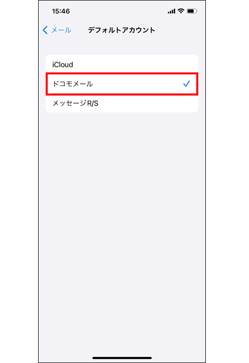 ※デフォルトアカウント設定にて、「メッセージR/S」にチェックが入っているとメール送信が出来ません。 ※操作画面は、iOS 15.4(iPhone 12)を参考に掲載しております。ご利用の機種やOSバージョンにより表示画面や文言が大きく異なる場合があります。