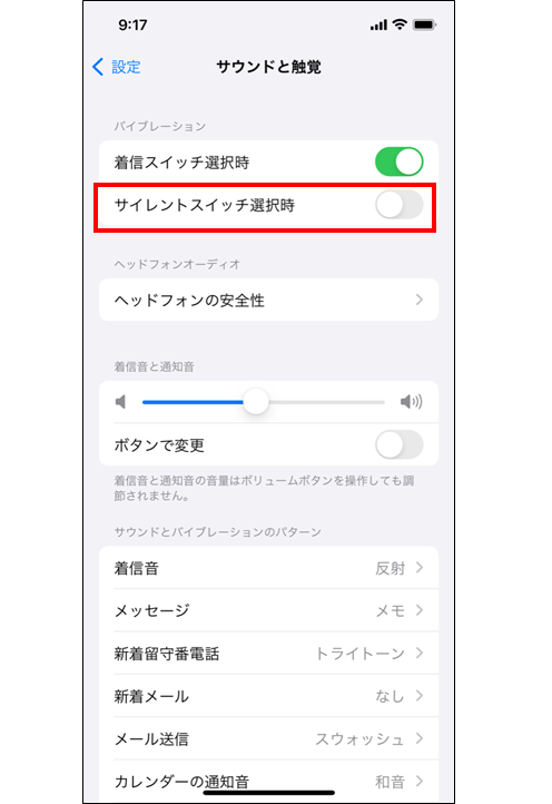③「サウンド」画面の「サイレントスイッチ選択時」のボタンをオフ(白い状態)にする