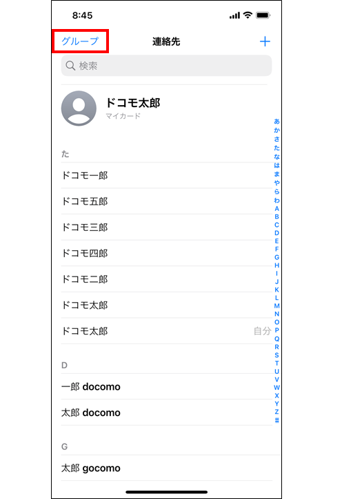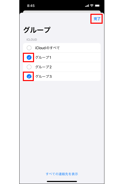ホーム画面にて、「連絡先」をタップ →左上「グループ」をタップ →表示したいアカウント・グループにチェックを入れる →「完了」をタップ