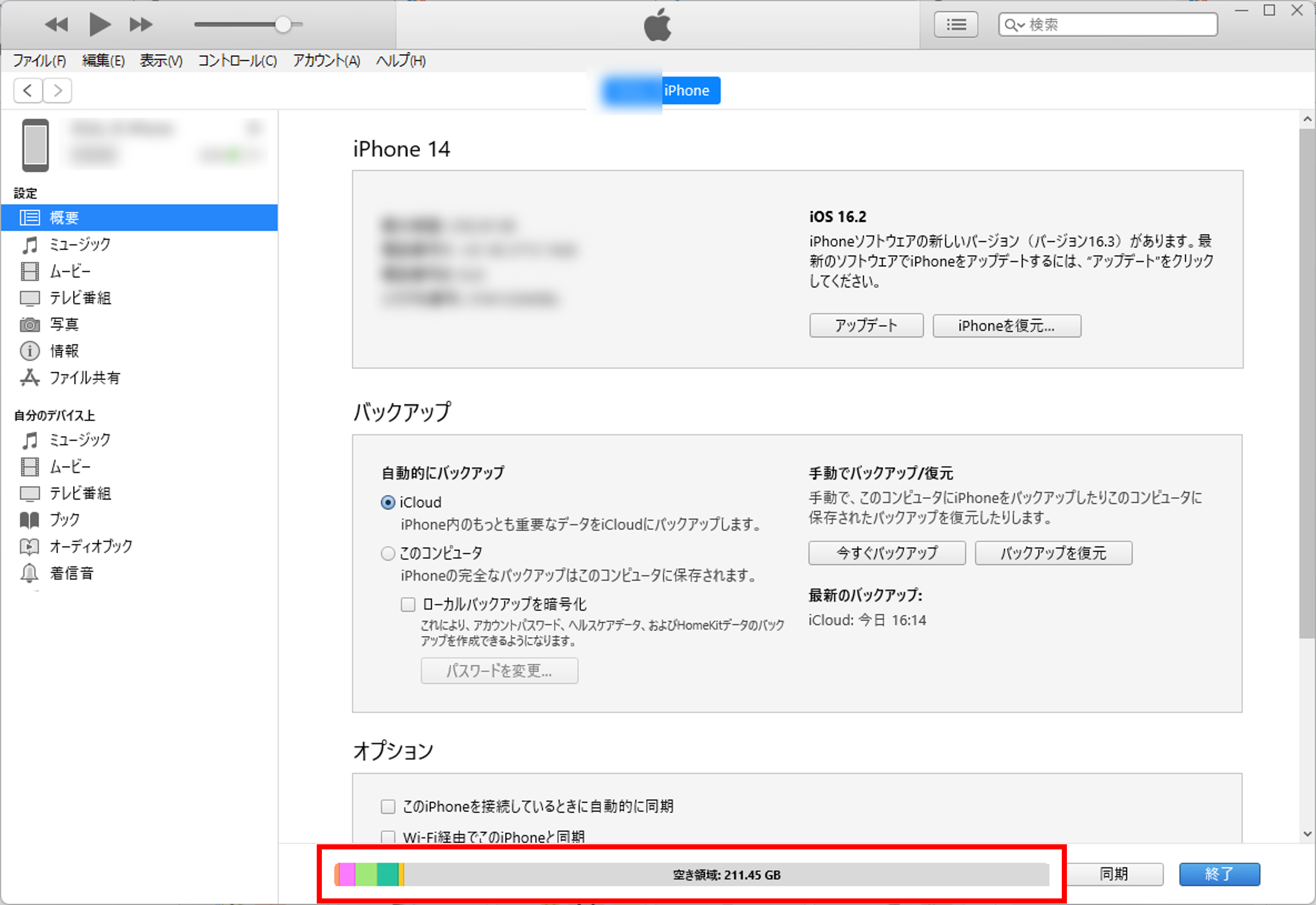 iPhoneまたはiPadをパソコンと接続し、iTunesを開いてiPhoneまたはiPadを選択すると、コンテンツ別にストレージの使用状況が表示されます。