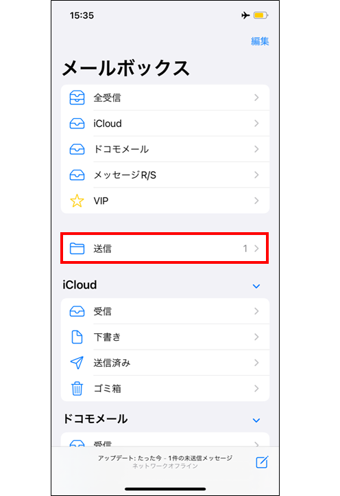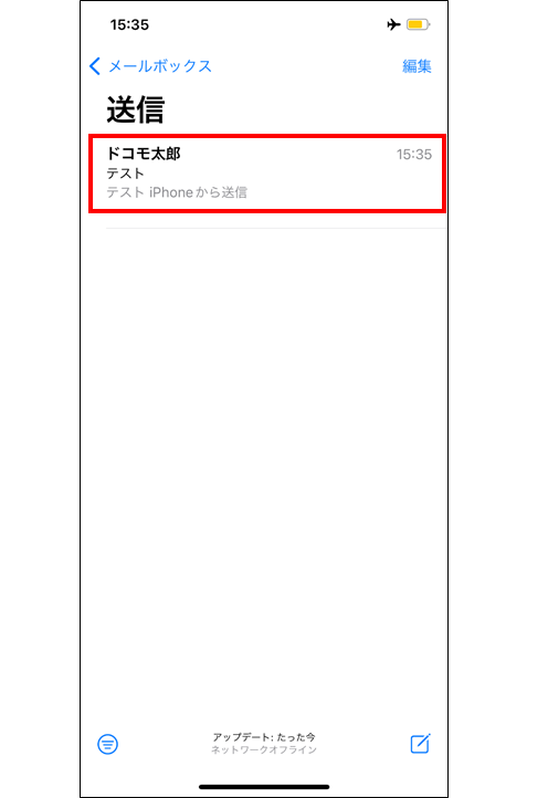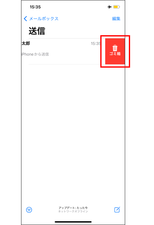 ホーム画面にて「メールアプリ」をタップ →「送信」をタップ →該当メールを左にスワイプ →「ゴミ箱」をタップし削除する