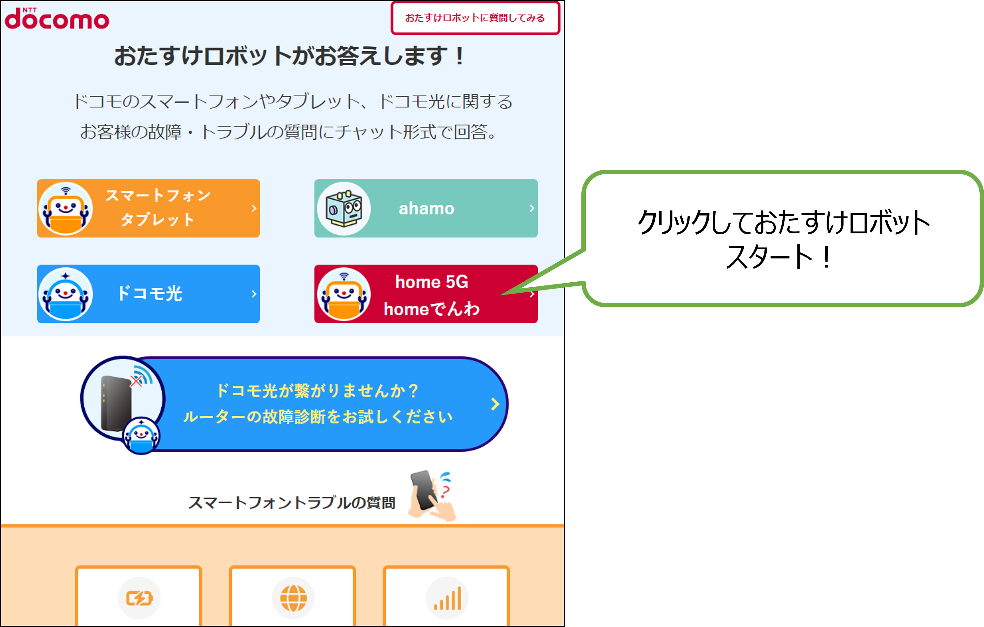 「スマートフォン・タブレット」や「ドコモ光」、「ahamo光」、「ahamo」のお困りごとを24時間365日で相談できるチャットボットです!