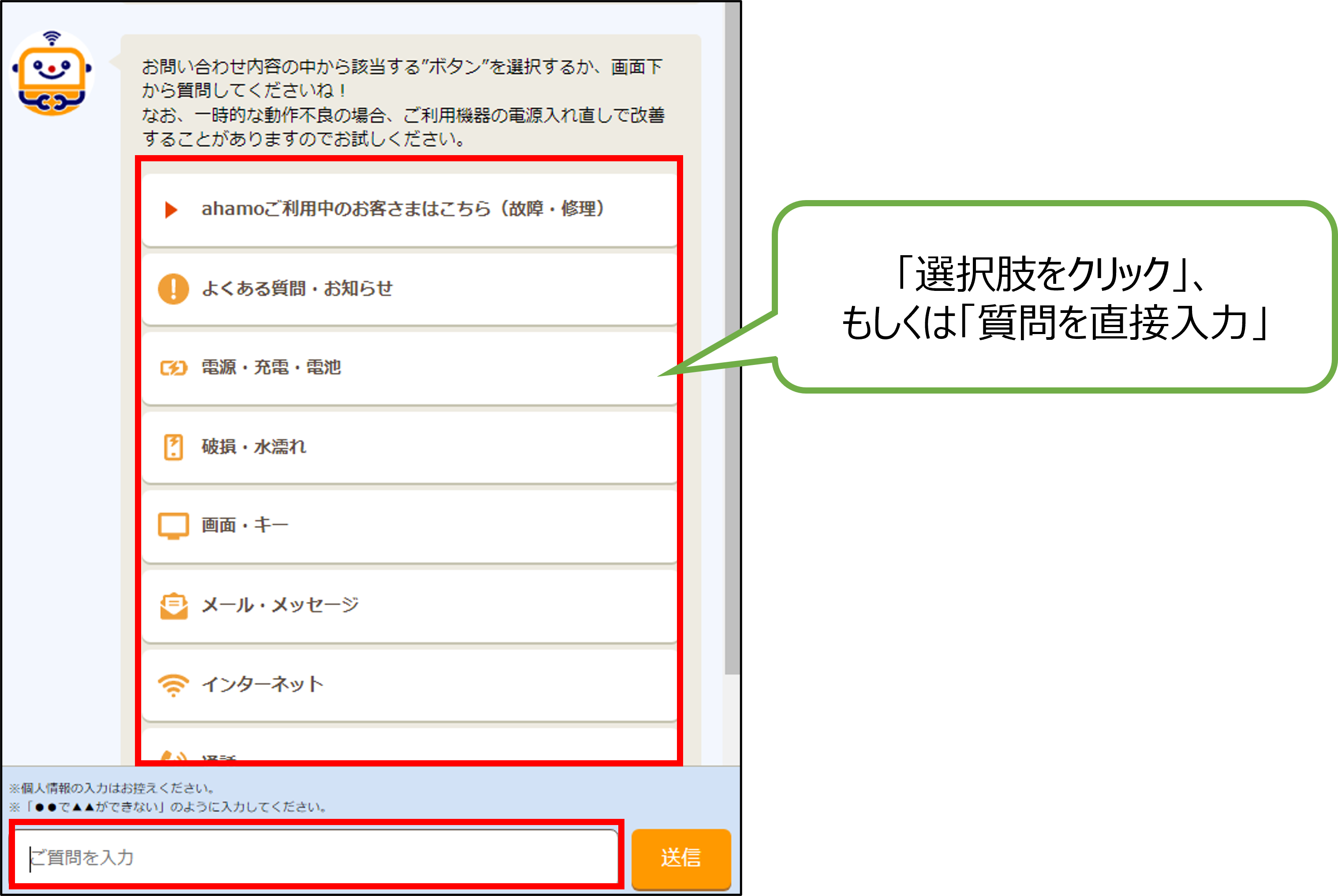 ② おたすけロボットが起動したら、「選択肢をクリック」もしくは「質問を直接入力」してください。