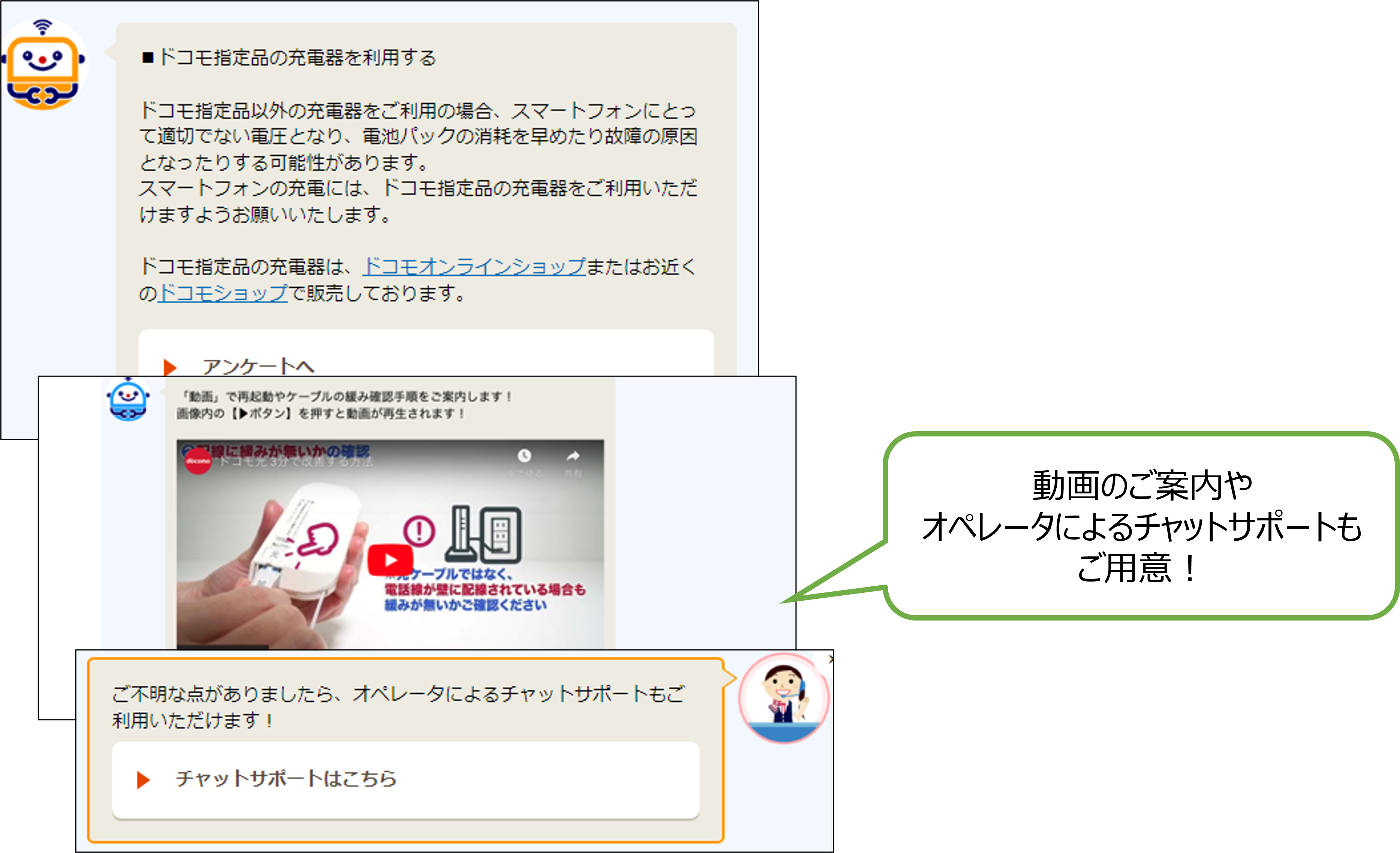 ドコモショップやドコモインフォメーションセンターの混雑時や営業時間外にも、お客さまの困りごとを手軽に解決できるようサポートいたします!
